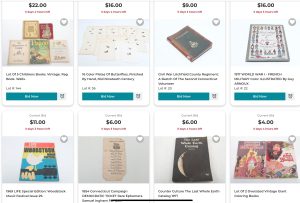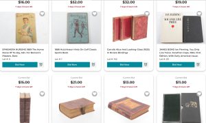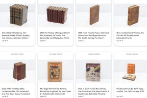 This auction catalog features a wide selection of antiquarian and collectible books, spanning subjects such as literature, religion, history, and science. Several items date to the early 19th century or earlier, including leather-bound works, engraved volumes, and regional imprints. Many books retain original bindings and handwritten inscriptions, offering insight into historical readership and ownership.