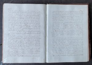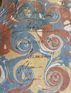402 handwritten pages (plus a few blank leaves at the end). In-quarto format (15×21 cm). Full calf binding, smooth spine with Directoire-style decoration. Binding heavily rubbed. Bluish paper, typical of the post-revolutionary era. Water stains on the first pages, otherwise clean. Endpapers detached from the pastedowns.