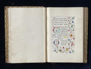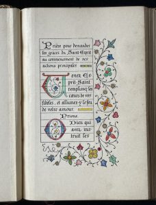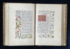 Petit Livre d’Heures. No place, no publisher, no date but before 1912, 32 leaves, 63 finely painted pages with ornate text, borders, and historiated initials. Repeated borders feature floral patterns, the host and chalice, and dragons. Contents include Prayers before Mass, The Confession, Prayers during Mass, The Commencement of the Mass, The Creed, The Offertory, The Preface, The Sanctus, The Canon, The Elevation of the Host, The Pater Noster, The Agnus Dei, The Benediction, and more.