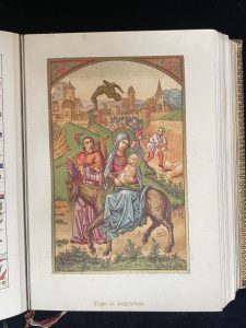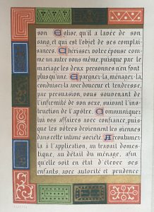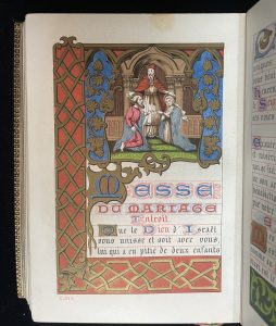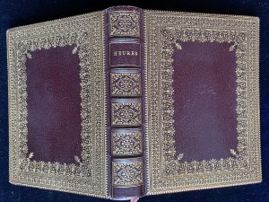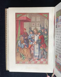 Original edition, illustrated with a frontispiece and 207 chromolithographs, including 5 engravings, with a different chromographic border for each page and several chapter headings. Superb chromographic illustrations inspired by medieval books of hours. Publisher’s binding in full brown morocco.