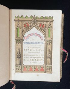 Heures choisies des Dames Chrétiennes. Approuvées par M.S. l’Évêque de Dijon. Tiré des manuscrits du XIIᵉ au XVIIᵉ siècle provenant du Cabinet de Mᵉ F. Baudot, à Dijon.