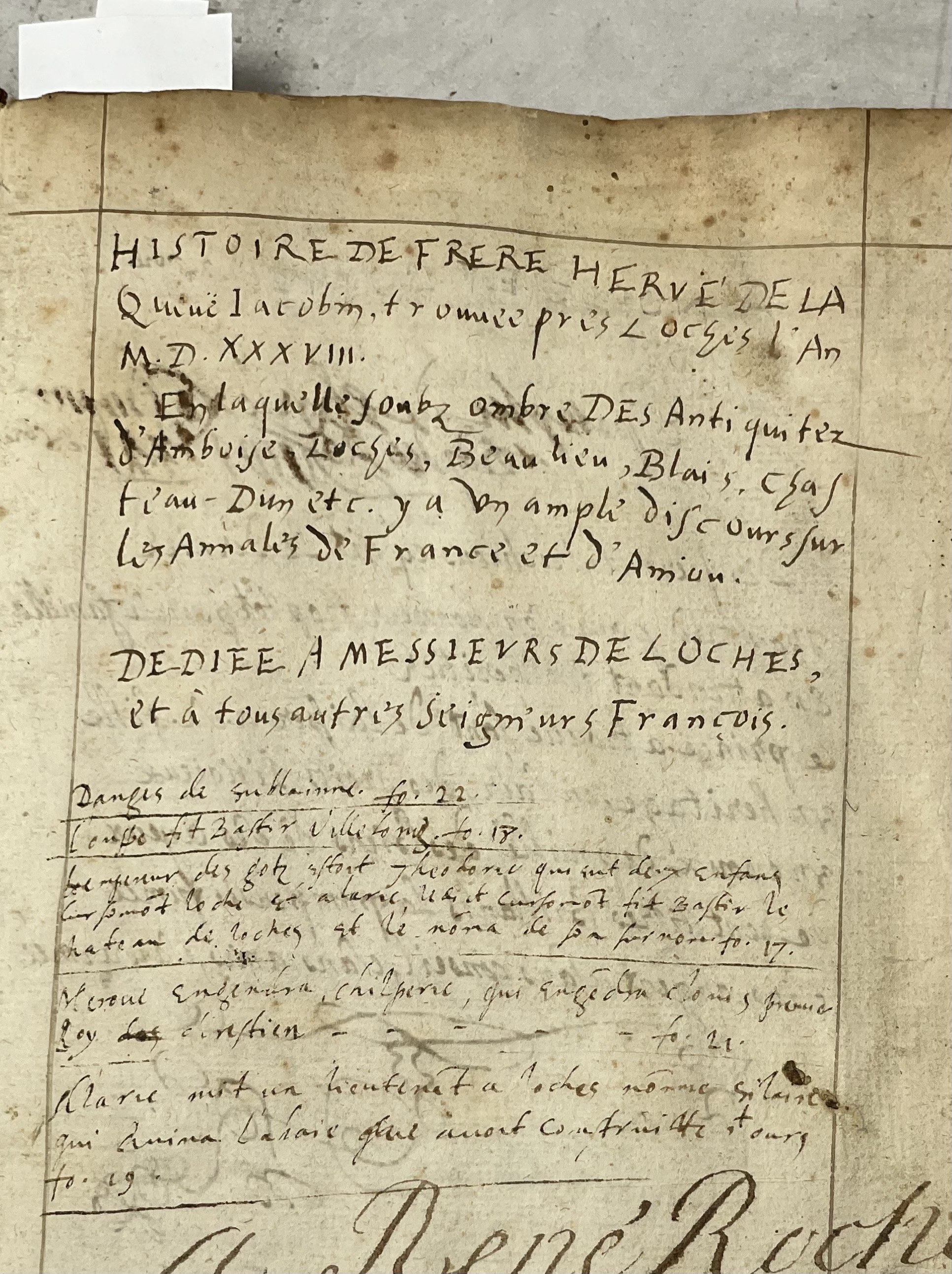 Published inHistoire écrite par frère Hervé de la Queue, Manuscript annotated by Pierre Moreau de Loches from Claude Aubron collection