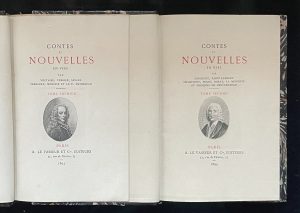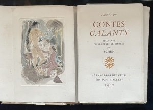 The 19th and 20th centuries saw continued reprints and adaptations of Grécourt’s works. The 1894 Parisian edition Contes et nouvelles en vers, which includes contributions from other authors, places Grécourt within a broader tradition of French verse storytelling. Finally, the 1952 Contes galants, illustrated by Schem and published by Éditions Vialetay, represents a modern reinterpretation, pairing Grécourt’s provocative tales with period-inspired artwork.