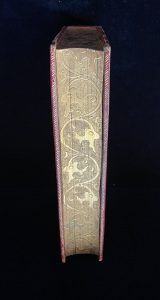“The Anvar-i Suhaili is a collection of Persian fables based on the Arabic Kalilah wa Dimnah. The translator, Edward Backhouse Eastwick (1814-83) was a professor and librarian at Haileybury College, the East India Company College in Hertfordshire and dedicated the work to Queen Victoria. According to a note in his hand, the binding of this volume was ‘finished entirely at Hertford, in the house of Mr Stephen Austin’ (Stephen Austin was the official printer for the East India Company). ‘The edging alone occupied a very superior workman seven days. The blocks for the ornaments on the outside were cut expressly from Oriental models. On the inside of each board is a painting done by hand and copied from a Persian M.S.’ This manuscript was formerly in the Mughal and Awadh royal libraries, now in the British Library (Add MS 18579). ”