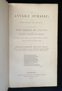 The Anvár-i Suhailí; or, The Lights of Canopus: Being the Persian Version of The Fables of Pilpay; or, The Book “Kalílah and Damnah,” Rendered into Persian by Husain Vá’iz Ul-Káshifí, Literally Translated into Prose and Verse by Edward B. Eastwick. Hertford: Printed and Published by Stephen Austin, MDCCCLIV [1854].