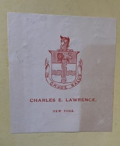 With the bookplate of Charles E. Lawrence of New York. The design includes a heraldic crest featuring a cross and a lion in the upper section, with a crest above depicting a fish. The Latin motto “In Cruce Salus” translates to “Salvation in the Cross”.