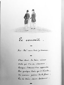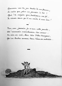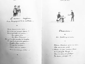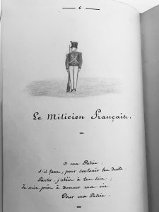 The remaining volumes—devoted primarily to poetry, songs, epigrams, and drawings—reveal the more intimate and artistic side of Durand. One volume is adorned with charming pencil and watercolor illustrations, allegorical scenes, military figures, domestic tableaux, and vignettes that accompany his verses. Many poems are set to popular airs, implying light public reading or performance. Letters addressed to Durand are copied throughout the set, and several original letters from his friend La Boissiere are loosely laid in Volume II, adding an important personal layer to the collection.